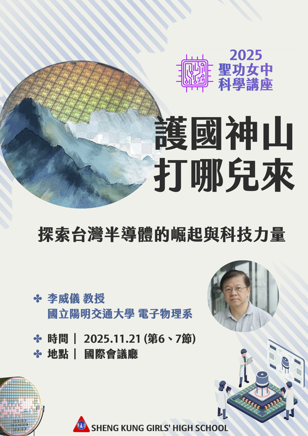 講座亦將帶領聽眾認識臺灣半導體產業的崛起歷程、關鍵技術突破與全球供應鏈位置,並討論「護國神山」對國家安全、經濟發展以及科技競爭力的重要性。透過深入淺出的科學解說與最新產業案例,讓學生從科技、工程與產業角度全面理解「護國神山」的真正來源。