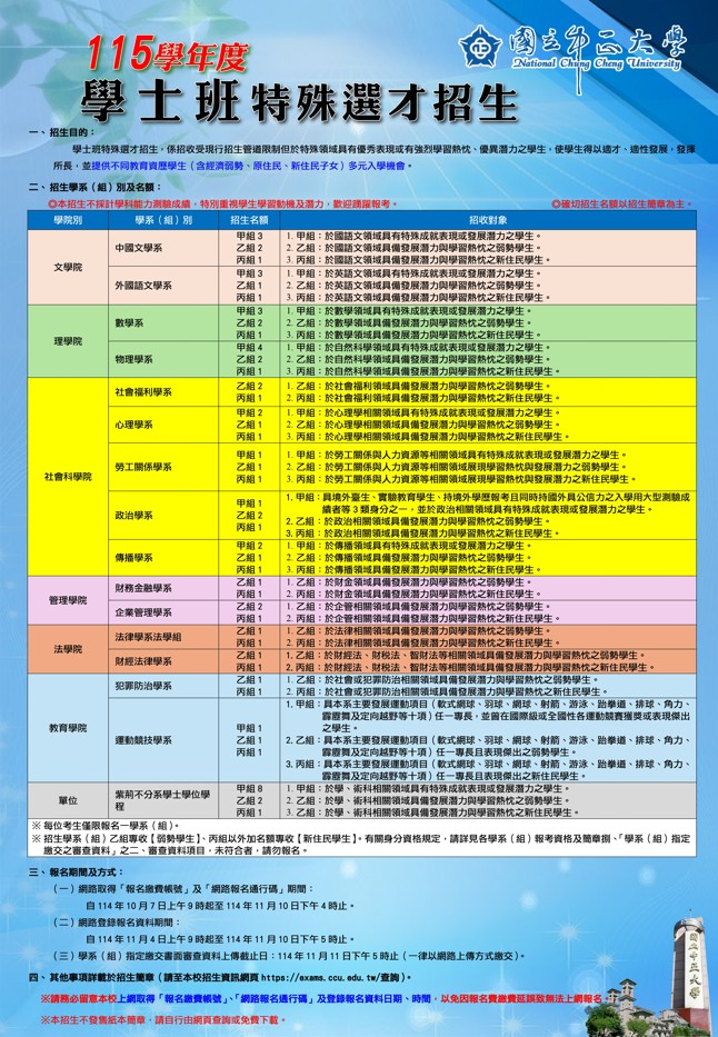 【特殊選才】中正大學115學年度學士班特殊選才(含新住民入學)招生相關資訊