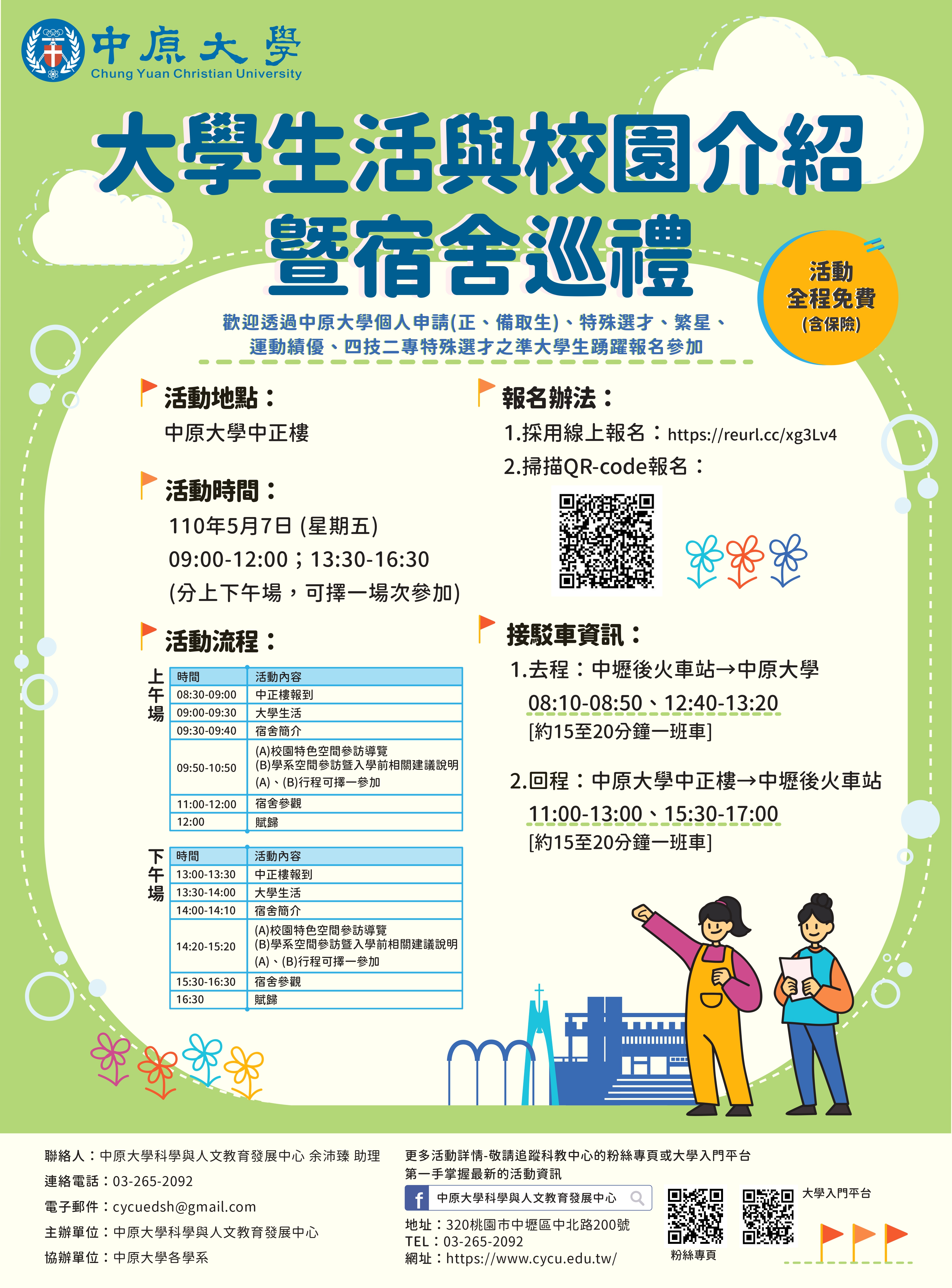 轉知中原大學舉辦「大學生活與校園介紹暨宿舍 巡禮」活動