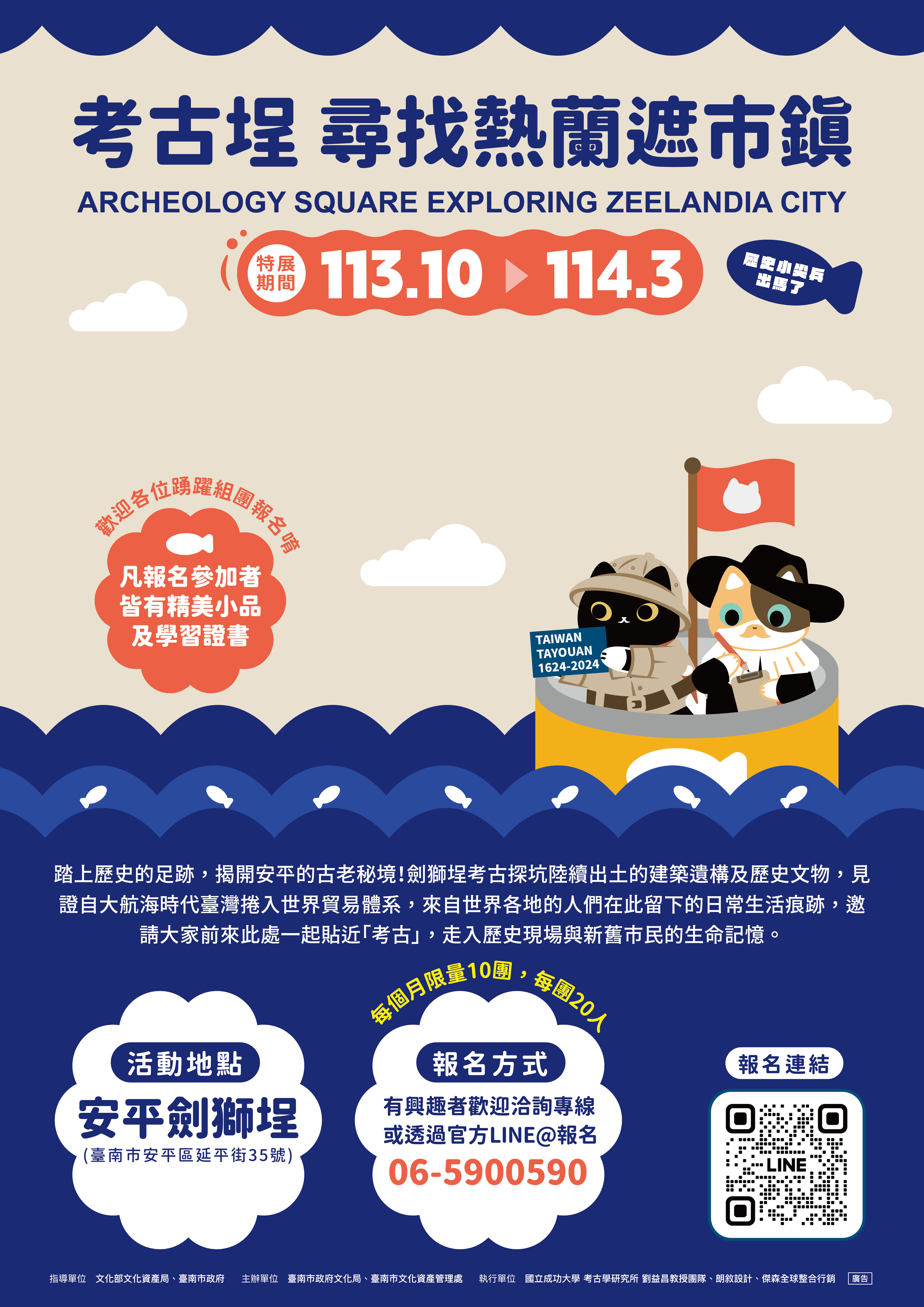 一、旨案為配合本市推動臺南400政策,本處規劃於安平劍獅埕考古發掘現地辦理研究成果之教育推廣展示,並有精彩特色活動於特展期間搭配開放民眾報名參與,檢附活動海報