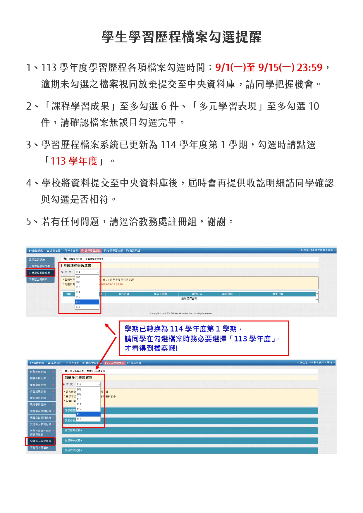 113學年度學習歷程各項檔案勾選時間:9/1(一)至9/15(一) 23:59,逾期未勾選之檔案視同放棄提交至中央資料庫,請高二、高三同學注意時程。
