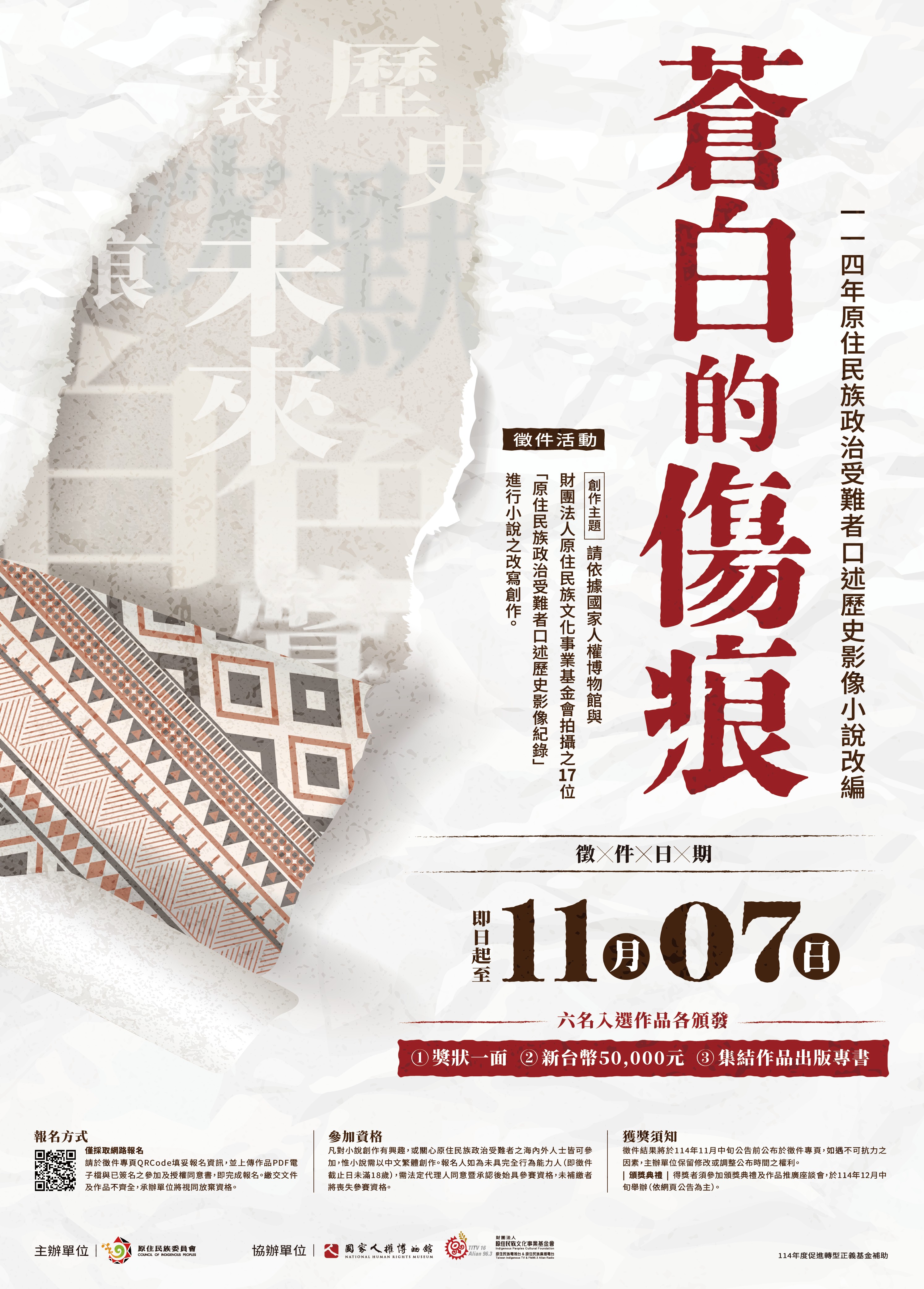 函轉原住民族委員會「114年度原住民族政治受難者口述 歷史影像小說改編徵件活動」活動簡章及海報各1份,請 查照。