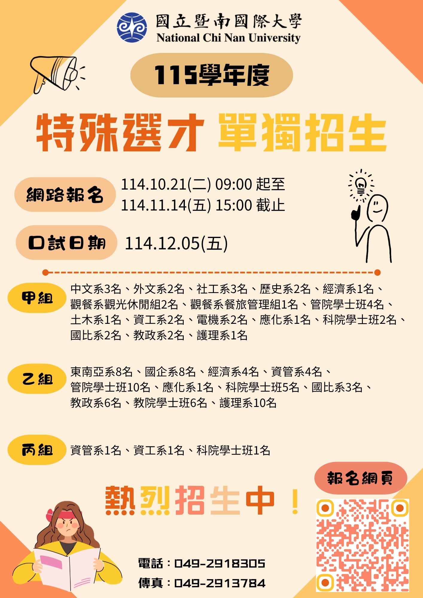 【特殊選才】國立暨南國際大學115學年度特殊選才單獨招生訊息