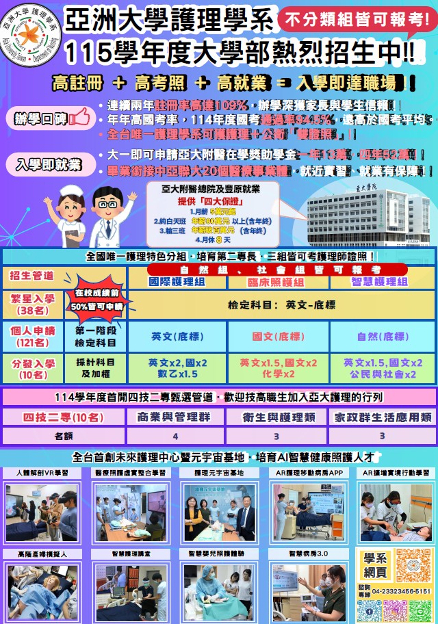 亞洲大學護理學系為全國首創「國際護理組」、「智慧護理組」、「臨床照護組」特色學程分組,培育學生第二專程;又特於課程規畫中加入「公共衛生師」考照模組課程;三組畢業後皆可報考高考護理師及公衛師國家級雙證照,培育國家醫療照護人才。