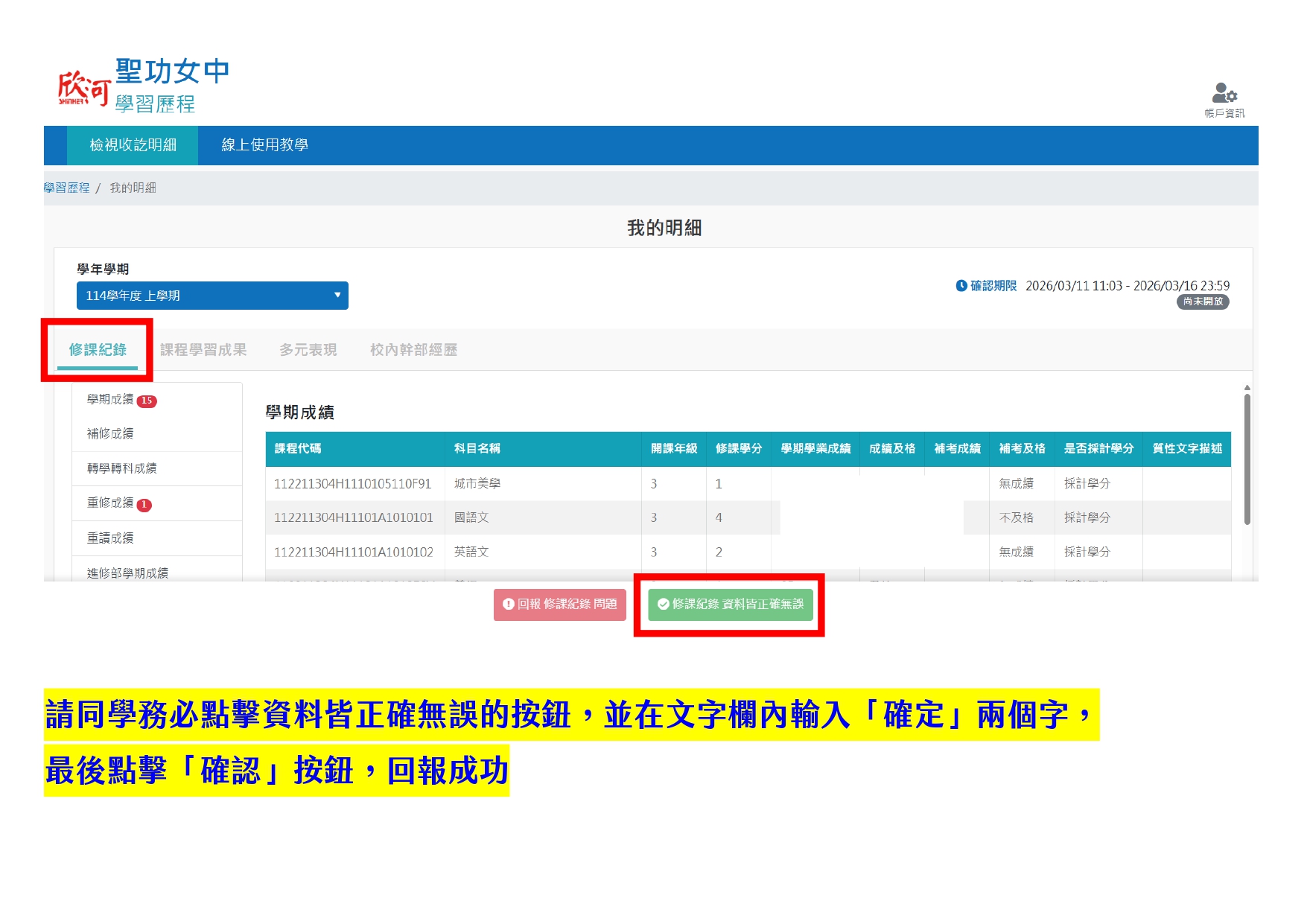 1.請同學於3/12(四)~3/16(一)上本校的學習歷程平台確認收訖明細。
