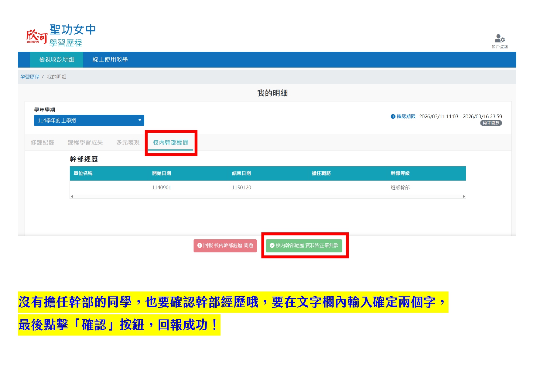 2.需要確認的資料有以下兩項,每位同學務必兩項都要確認,若沒有擔任幹部,也要確認幹部經歷。